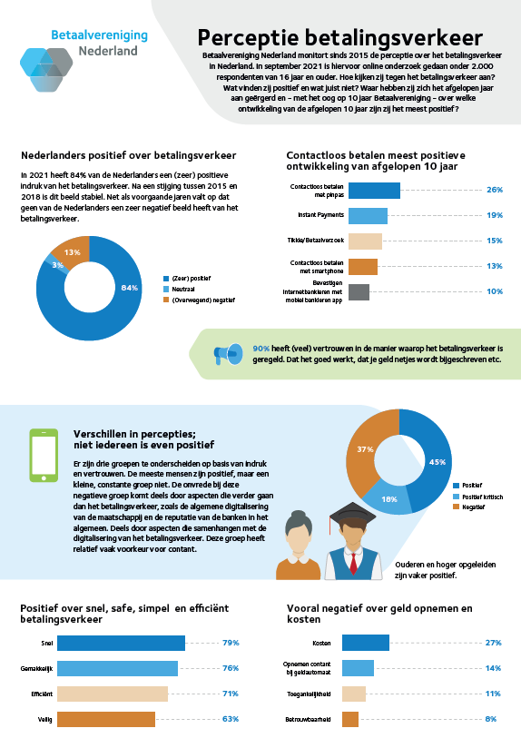 Betaalvereniging Nederland monitort sinds 2015 de perceptie over het betalingsverkeer in Nederland. In september 2021 is hiervoor online onderzoek gedaan onder 2.000 respondenten van 16 jaar en ouder. Hoe kijken ze tegen het betalingsverkeer aan? Wat vinden ze positief en wat juist niet? Waar hebben ze zich het afgelopen jaar aan geërgerd en – met het oog op 10 jaar Betaalvereniging – over welke ontwikkeling van de afgelopen 10 jaar zijn ze het meest positief? Bekijk de infographic…
