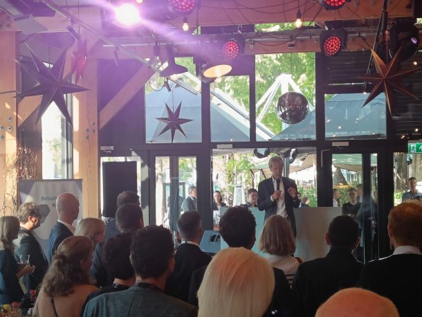 Op 10 oktober 2022 opende Koningin Maxima in de Amsterdam RAI het Sibos– congres (vroeger bekend als SWIFT International Banking Operations Seminar), waar enkele duizenden financiële professionals van over de hele wereld elkaar ontmoetten. Het congres bracht onder meer een groot aantal mensen uit de wereld van het Europese betalingsverkeer bij elkaar. De betalingsverkeerprofessionals uit het netwerk van de Betaalvereniging en de vier grootste Nederlandse banken ontmoetten elkaar echter al eerder, op de dag voordat het congres van start ging in Strand Zuid, direct naast de conferentielocatie. Tijdens deze receptie was er de gelegenheid om oude contacten aan te halen en nieuwe ontwikkelingen in de sector te bespreken. Betaalvereniging-voorzitter Gottfried Leibbrandt sprak de aanwezigen toe met een welkomstwoord. Daarna was er de gelegenheid om onderling bij te praten in de herfstzon. De congresgangers konden bovendien alvast hun badge ophalen voor de volgende dag. De bijeenkomst werd goed bezocht en kende een energieke sfeer die voor de aanwezigen de aftrap vormde van een drukke week vol informatie uitwisselen en netwerken.