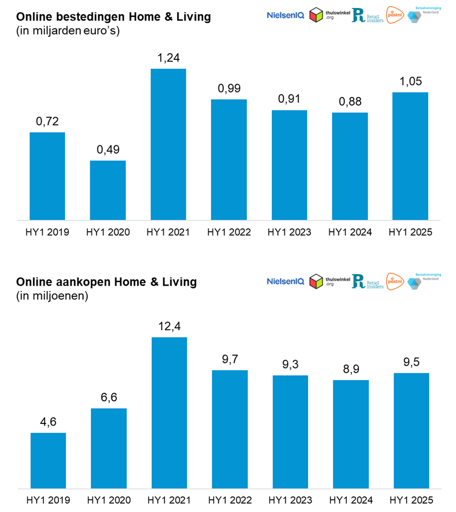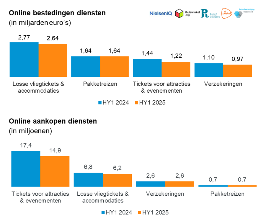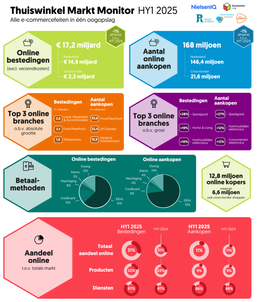 Nederlandse consumenten hebben in het eerste halfjaar van 2025 ruim € 17 miljard online uitgegeven, 1% minder dan in dezelfde periode vorig jaar. Deze afname komt door dalende uitgaven aan diensten (-7%). Het totaal aantal online aankopen komt uit op 168 miljoen (-1%), waarvan 144 miljoen productaankopen zijn. Het aantal aankopen van diensten daalde met -12%. Dit blijkt uit de nieuwste cijfers van de Thuiswinkel Markt Monitor, het onderzoek naar online consumentenaankopen in Nederland. Het onderzoek wordt door NielsenIQ (NIQ) uitgevoerd, in opdracht van Thuiswinkel.org en Retail Insiders en in samenwerking met PostNL en Betaalvereniging Nederland.
