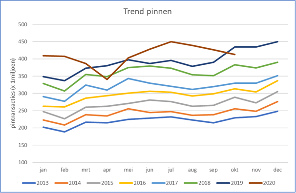 Vorige maand waren er met zo’n 413 miljoen transacties ruwweg 5% mínder binnenlandse pinbetalingen dan in oktober 2019. In september waren er nog 9,3% méér pinbetalingen dan een jaar eerder. Voor heel 2020 t/m oktober ligt het totale aantal pinbetalingen nog altijd ongeveer 7,5% hoger dan voor dezelfde maanden van 2019. April had dit jaar de sterkste daling van het aantal pinbetalingen: 10,3% minder dan vorig jaar.