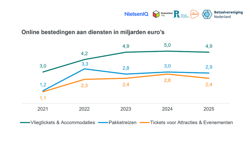 Voor het eerst sinds 2021 laat de dienstensector een daling zien, zowel in online aankopen (-11%) als bestedingen (-5%). Tickets voor attracties en evenementen dalen het meest in zowel bestedingen (-12%) als het aantal aankopen (-14%). Met name concerten, festivals en sportevenementen laten een terugval zien ten opzichte van eerdere jaren.