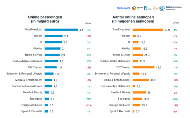 De online bestedingen aan producten blijven groeien (+2%). Vooral Home & Living (+12%), Huishoudelijke Elektronica (+10%) en Food & Nearfood (+4%) dragen bij aan deze groei. Ook speelgoed laat een sterke stijging zien (+24%).