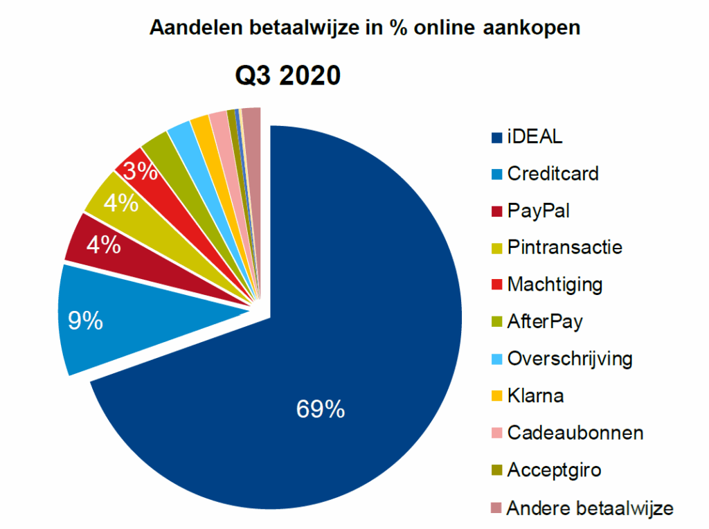 Het aandeel van iDEAL als betaalwijze van de online aankopen is opnieuw gestegen (van 61% in Q3 2019 naar 69% in Q3 2020). Daarnaast is het interessant om te zien dat iDEAL ook de populairste betaalmethode is voor cross-border aankopen. Dit komt mogelijk omdat populaire buitenlandse partijen als AliExpress en Amazon deze methode ook aanbieden.