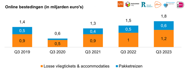 Waar vorig jaar in Q3 de online bestedingen aan pakketreizen en losse vliegtickets en accommodaties nog vergelijkbaar waren met 2019, het laatste jaar zonder Covid-19, schieten de online bestedingen aan deze categorieën in 2023 omhoog met gemiddeld 24%. Deze stijging is te verklaren door een flinke toename in boekingen in september, vooral last-minutes voor de herfstvakanties.