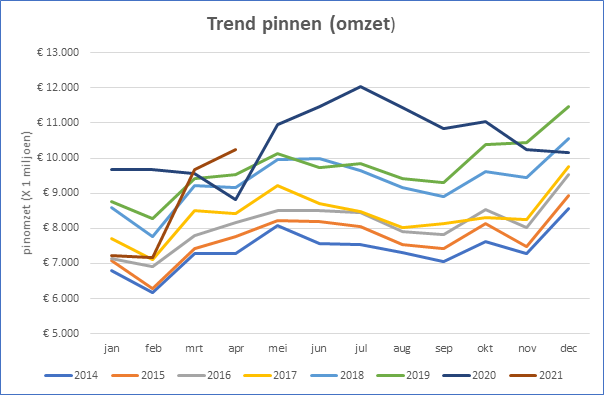 In april is er 2,6% vaker gepind dan in maart en 7,6% vaker dan in april 2020. April 2020 was echter een buitengewoon slechte pinmaand, middenin de eerste lockdown. Ten opzichte van april 2019, vóór corona, werd er nog steeds 3,6% minder vaak gepind.