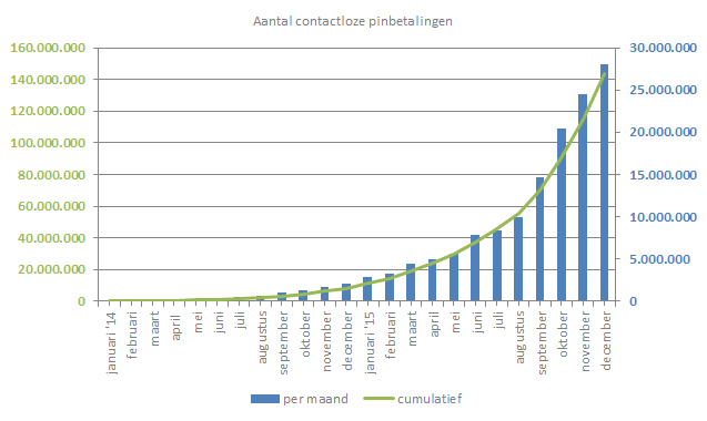 Sinds de introductie begin 2014 pinnen consumenten steeds vaker contactloos. Bijna 135 miljoen aankopen werden in 2015 contactloos gepind . Inmiddels zijn er meer dan 15 miljoen contactloze betaalpassen en mobiele telefoons met betaalapp in omloop. Consumenten kunnen hiermee bij 123.000 betaalautomaten in Nederland (meer dan 1 op de 3) contactloos betalen.
