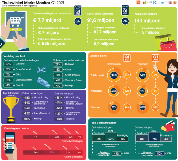 Niet alleen waren er in Q1 van dit jaar bijna 1 miljoen nieuwe online kopers ten opzichte van dezelfde periode vorig jaar, maar het gemiddeld besteed bedrag per online koper is ook sterk gestegen. De groei (+ 34%) bij Nederlandse webwinkels is beduidend hoger dan bij internationale webwinkels (+10%). Dit blijkt uit de meest recente versie van de Thuiswinkel Markt Monitor, het onderzoek naar online consumentenbestedingen in Nederland. Dit onderzoek wordt door GfK uitgevoerd, in opdracht van Thuiswinkel.org en Retail Insiders en in samenwerking met PostNL , Betaalvereniging Nederland en Currence .