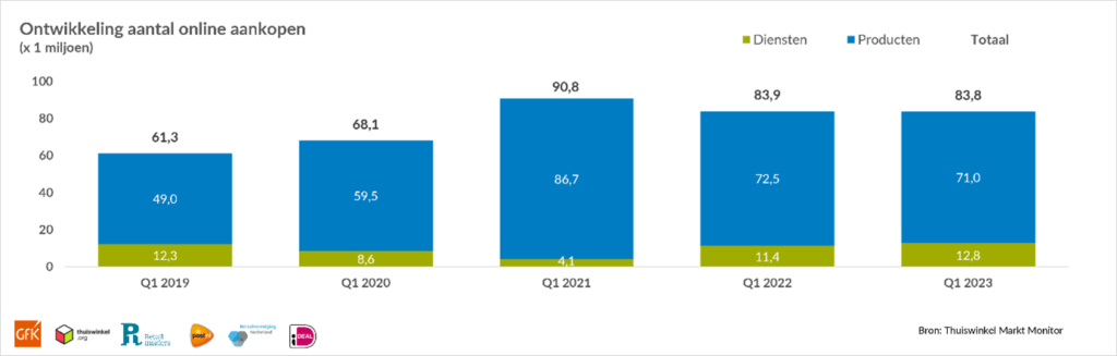 Binnen het aantal aankopen is een duidelijk verschil tussen producten en diensten. Het aantal online gekochte diensten blijft stijgen (+12% t.o.v. Q1 2022), terwijl het aantal online gekochte producten iets daalt (-2% t.o.v. Q1 2022). Deze trend zagen we ook in 2022 (+49% diensten en -10% producten t.o.v. 2021), maar dit jaar zijn de verschillen minder extreem. Ook hier lijkt dus sprake van stabilisatie.