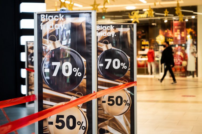 Winkelcentrum met Black Friday-borden waarop kortingen van 70% en 50% worden aangekondigd, met shoppers en feestelijke decoratie op de achtergrond.