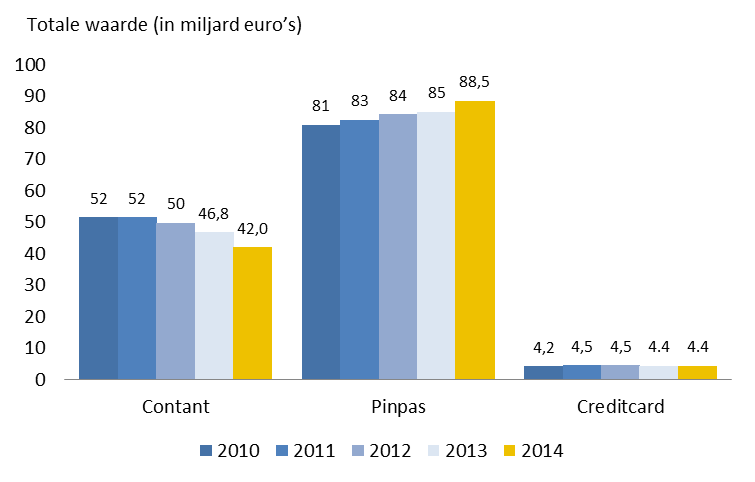 Gemiddeld rekenden Nederlanders in 2014 53% van al hun aankopen aan de kassa met contant geld af en 45% met hun pinpas. De verschillen naar sector zijn echter groot. In 2014 was in de detailhandel voor het eerst het aandeel pinbetalingen hoger dan het aandeel contante betalingen. Deze sector omvat winkels zoals supermarkten of kledingwinkels. Consumenten rekenden in deze sector 50% van hun betalingen af met hun pinpas en 49% met contant. In andere sectoren zoals de horeca of de particuliere dienstverlening is contant nog steeds dominant, al zien we ook hier een duidelijke toename van het aandeel pinnen.
