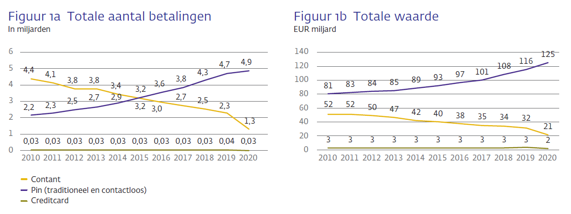 Tussen 2019 en 2020 is het totale aantal betalingen door consumenten in winkels, in de horeca, benzinestations, op de markt en bij dienstverleners afgenomen van ruim 7,0 miljard naar 6,2 miljard betalingen, een afname van 12%. Wel is het gemiddelde betaalde bedrag gestegen van EUR 21,56 naar EUR 24,04. Consumenten hebben vooral minder vaak contant betaald. In 2020 werden 1,30 miljard aankopen contant betaald (waarde EUR 21 miljard), tegen 2,28 miljard in 2019 (waarde EUR 32 miljard). Het aantal pinbetalingen is gestegen van 4,70 miljard betalingen (waarde EUR 116 miljard) naar 4,87 miljard betalingen (waarde EUR 125 miljard). De meeste pinbetalingen – zo’n 80% – doen consumenten inmiddels contactloos met hun betaalpas of smartphone waarbij zij deze dicht tegen de betaalterminal aanhouden. Consumenten gingen vooral fors minder vaak contant betalen in het voorjaar van 2020, tijdens de eerste lockdown, toen winkeliers het gebruik van contant geld ontmoedigden. Inmiddels wordt ongeveer een op de vijf aankopen contant betaald, wat nog steeds fors minder vaak is dan voor het begin van de pandemie toen consumenten drie op de tien aankopen contant afrekenden.