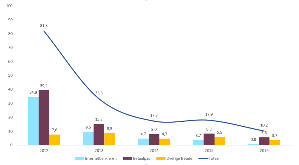 De schade als gevolg van fraude in het betalingsverkeer daalde in 2016 met 43% van 17,9 miljoen naar 10,2 miljoen euro. Dat blijkt uit cijfers van de Betaalvereniging en de Nederlandse Vereniging van Banken.