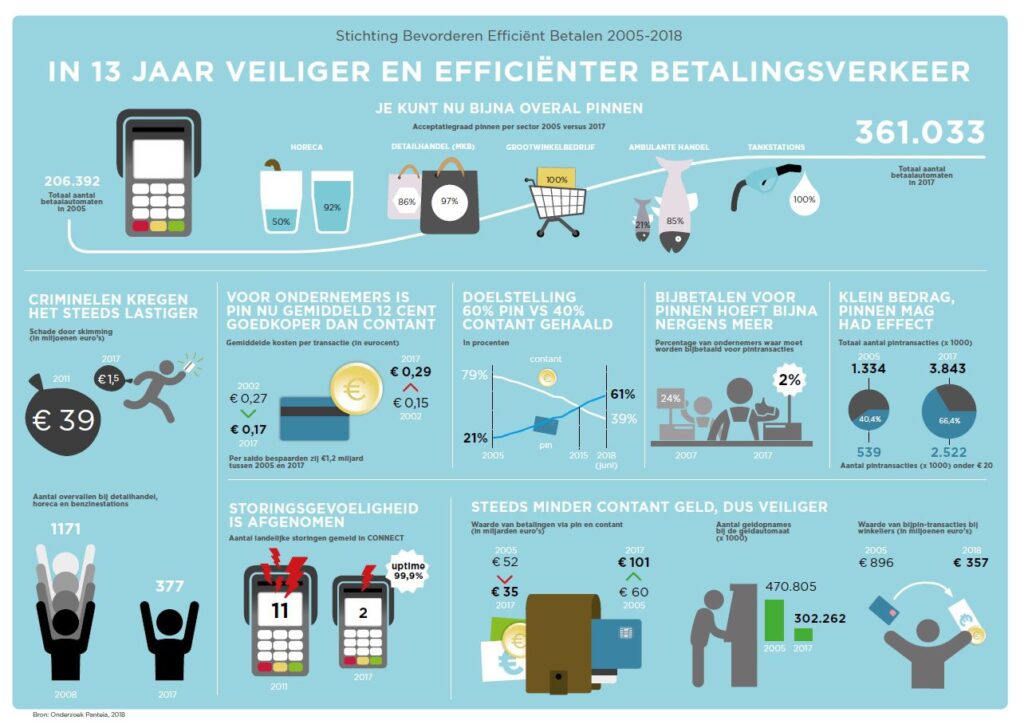 De afname van het gebruik van contant geld zorgt ervoor dat betalen in Nederland veiliger wordt. Lege kassalades zijn immers minder aantrekkelijk voor criminelen. Het aantal overvallen bij winkeliers, horecagelegenheden en benzinestations is tussen 2008 en 2017 dan ook gedaald van 1.171 naar 377. De schade door skimming daalde tussen 2011 en 2017 van € 39 miljoen naar € 1,5 miljoen, vooral dankzij de invoering van het Nieuwe Pinnen eind 2011. Daarbij pinnen consumenten niet langer met de magneetstrip maar met de EMV-chip in de betaalpas. De Stichting zorgde ervoor dat ondernemers hun betaalterminals versneld gingen vervangen. Met promotiemateriaal en commercials werd iedereen geïnformeerd en de banken voorzagen alle betaalpassen van de EMV-chip.