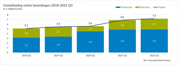 In het derde kwartaal van 2022 zijn de online consumentenbestedingen iets toegenomen. In totaal hebben Nederlandse consumenten in Q3 2022 € 7,2 miljard online uitgegeven, 4% meer dan in Q3 2021. Deze groei wordt veroorzaakt door een groei in online bestedingen aan diensten (+14%), aangejaagd door een groei in pakketreizen (+20%) en tickets voor attracties en evenementen (+19%). Het aantal aankopen van diensten blijft redelijk stabiel (+1%), maar omdat consumenten minder producten kopen daalt het totaal aantal online aankopen wel (-5%) vergeleken met Q3 2021. Dit blijkt uit de meest recente versie van de Thuiswinkel Markt Monitor, het onderzoek naar online consumentenbestedingen in Nederland. Dit onderzoek wordt door GfK uitgevoerd, in opdracht van Thuiswinkel.org en mede-opdrachtgever Retail Insiders en in samenwerking met PostNL, Currence en Betaalvereniging Nederland.