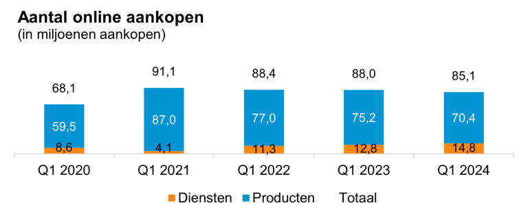 De helft van de online aankopen wordt gedaan met een laptop of desktop. Na een aantal jaren van groei stabiliseert het gedeelte van de aankopen dat met een smartphone wordt gedaan: zowel in Q1 2023 als Q1 2024 is dat 35%. Het aandeel bestedingen gedaan met een smartphone is in Q1 2024 wel gestegen, van 24% naar 27%.
