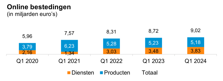 Diensten groeien in zowel online bestedingen (+10%) als online aankopen (+15%) (zie figuur 1). Opvallend in het eerste kwartaal van 2024 is dat voornamelijk bestedingen aan Verzekeringen toenemen (+34% t.o.v. Q1 2023). Bestedingen aan Tickets voor Attracties en Evenementen nemen ook toe (+23%) terwijl bestedingen aan reizen juist minder hard groeien dan voorheen (+0,3%).