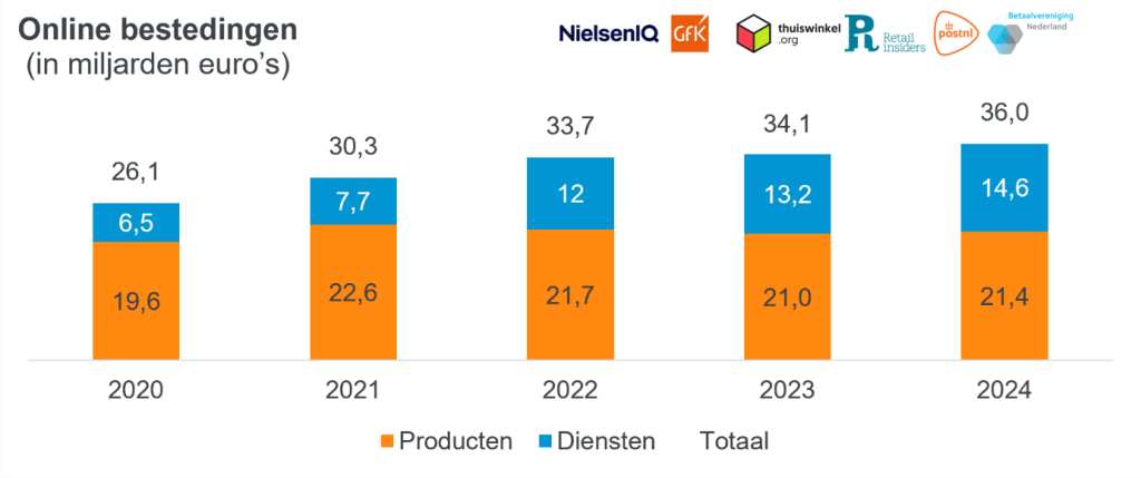 Dutch consumers spent €36 billion online in 2024, a growth of 5% compared to 2023. The number of online purchases fell by 1% to 345 million. 12% of online spending and purchases went to foreign webshops, accounting for €4.4 billion ( 12%) and 41 million purchases ( 4%). This is according to the latest figures from the Thuiswinkel Markt Monitor, the research into online consumer spending in the Netherlands. This research is conducted by NielsenIQ GfK on behalf of Thuiswinkel.org and Retail Insiders and in cooperation with PostNL and Dutch Payments Association.
