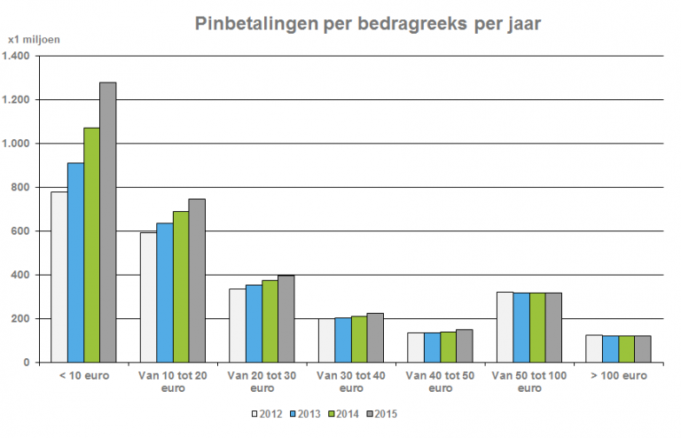 Nederlandse consumenten pinden in 2015 meer dan ooit. Het aantal pinbetalingen bereikte in 2015 met 3,225 miljard opnieuw een record . Ten opzichte van 2014 is dit een groei van 10,7%. Net zoals voorgaande jaren zat de sterkste groei in de pinbetalingen tussen € 0 tot € 10. Dit aantal steeg tot een totaal van bijna 1,3 miljard. Dat is 40% van alle pinbetalingen. Binnen dit segment lieten de betalingen van 0 tot € 2,50 een groei zien van 35% ten opzichte van 2014.