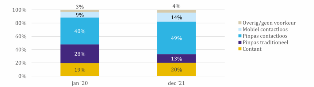 Steeds meer Nederlanders betalen bij voorkeur contactloos, zowel met de pinpas als met de mobiele telefoon. Aan het begin van 2020 betaalde de helft van de Nederlanders het liefst contactloos: 40% gaf de voorkeur aan contactloos betalen met de pinpas, en 9% aan contactloos betalen met de mobiele telefoon. Aan het einde van 2021 lag de voorkeur voor contactloos betalen 14 procentpunten hoger: toen betaalde 49% van de Nederlanders het liefst contactloos met de pinpas en 14% het liefst contactloos met de mobiele telefoon. De stijging aan populariteit van deze twee betaalmethodes is ten koste gegaan van de populariteit van pinnen op de traditionele manier, waarbij de pinpas in de betaalautomaat moet worden gestoken.