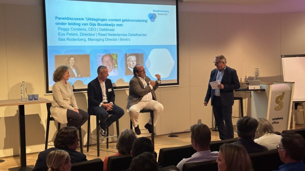 The animated meeting ended with a panel discussion between CEO Peggy Corstens of Geldmaat , director Eus Peters of the Dutch Retail Trade Council and managing director Bas Rodenberg of cash carrier Brink’s . Discussion leader Gijs Boudewijn, director of the Payments Association, questioned the panellists on the challenges of the emerging cash acceptance obligation. The panel concluded that we should strive for innovative, secure and affordable opossessions.